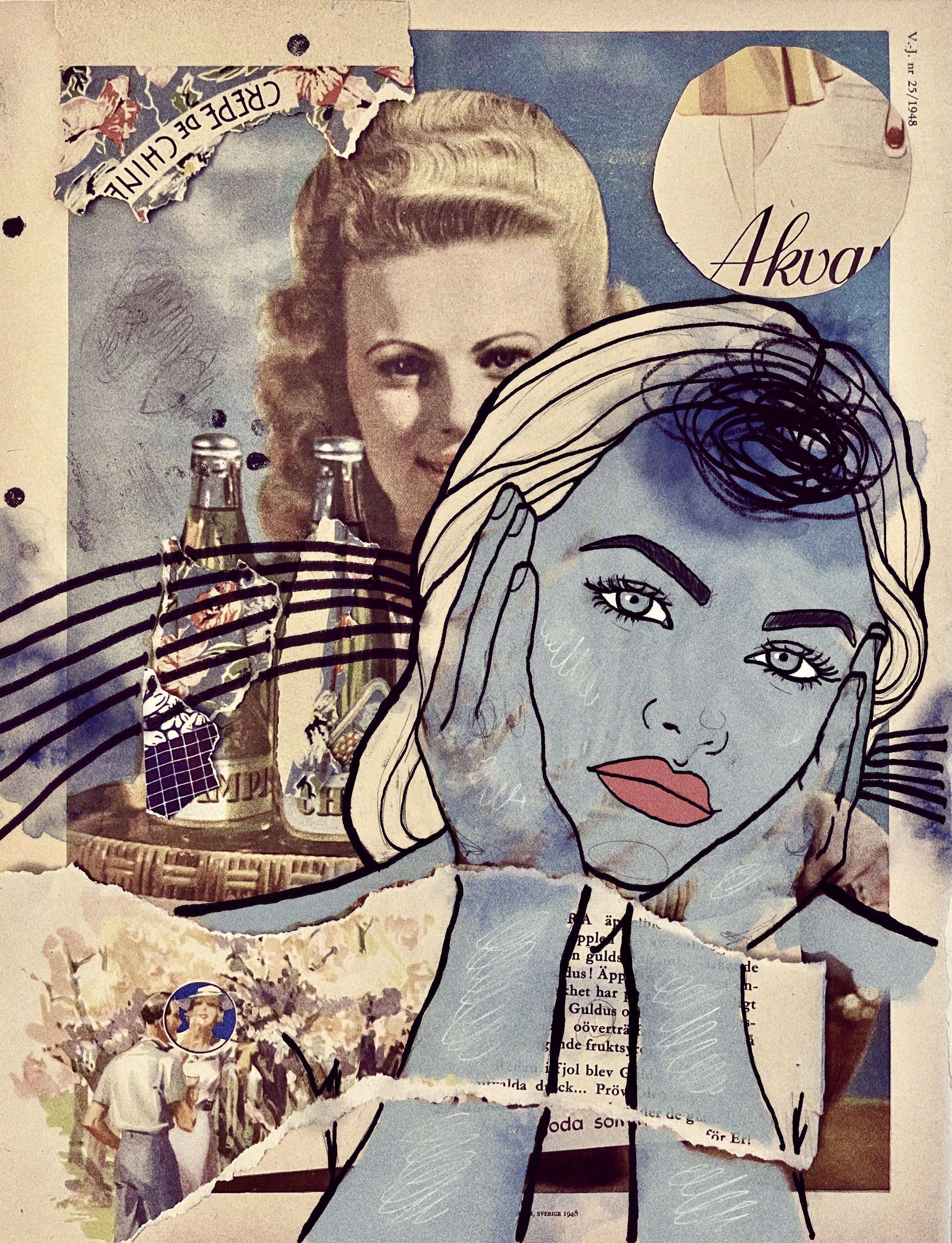 Elements like the torn "Crêpe de Chine" label, Akvavit tag, and snippets of old-world landscapes create a palpable sense of nostalgia. Yet, amidst these fragments of the past, the woman's piercing eyes, painted in vivid blue, draw the viewer into her world—one of introspection, resilience, and perhaps a quest for self-recognition.