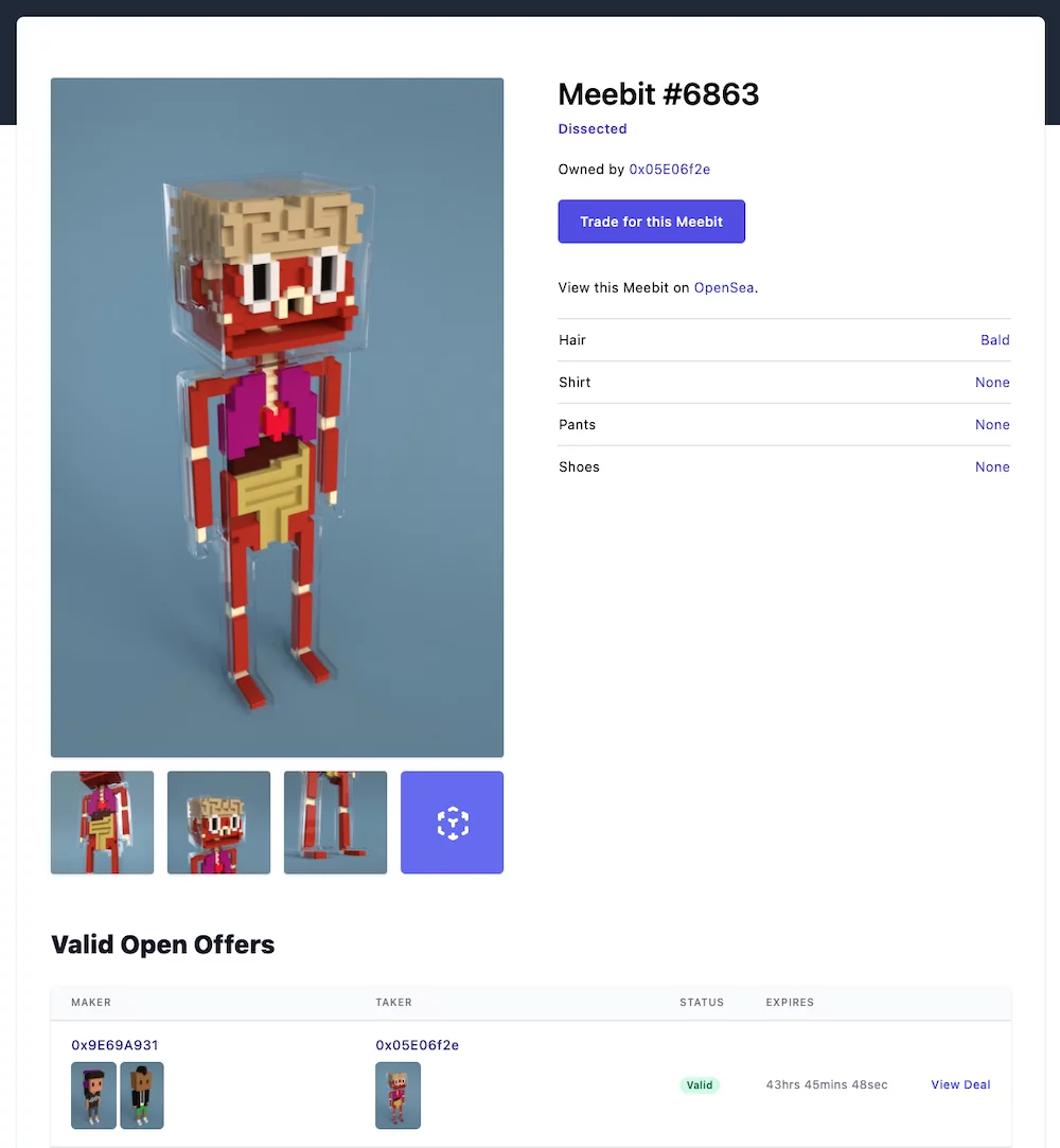 Larva Lab’s built in marketplace allowing native Meebit trading might not seem like a killer feature when first considered, but don’t underestimate the potential impact of this crucial addition! This particular capability is more than just another practical, forward-thinking, and deliberate addition made by the developers. It’s one which I suspect will result in unprecedented user engagement, thanks largely to the minimal friction Meebit community members will experience swapping for their most desired Meebits. At last, without the worry of having to trust a 3rd party to handle such NFT trades. The marketplace supports simple buy, bid and sell transactions, as well as more complex trades involving up to 50 Meebits on each side of the transaction. The capability to swap many for many, many for few, as well as the ability to deposit and add ETH to pose trades with as well, all from within the Larva Labs native Meebits marketplace is a most welcome new addition! Long-time community members will definitely be making extensive use of this feature.