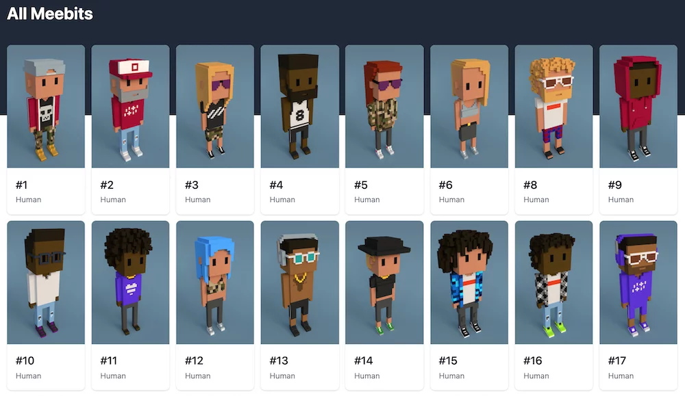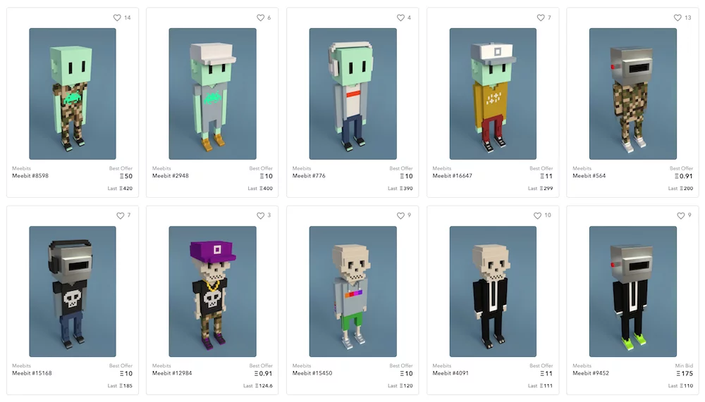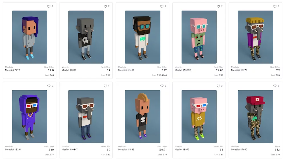 - Each Meebit is a unique 3D voxel character, created by a custom generative algorithm, and registered on the Ethereum blockchain.