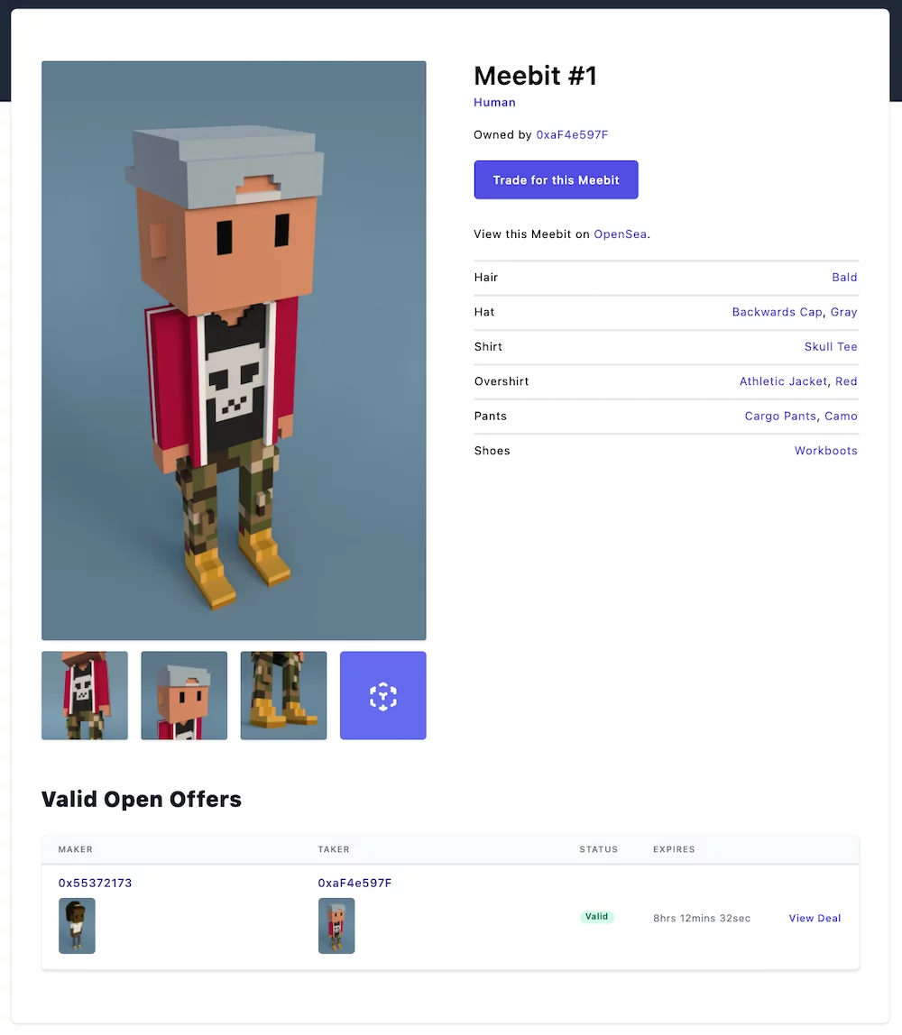 - Also included in the contract is a custom no-fee marketplace that supports like-kind trading of up to 100 Meebits per transaction, along with all the standard buy, bid, and ask transactions.