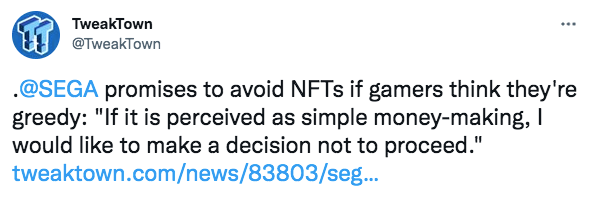 Lots of games companies have expressed interest in developing NFTs, but few seemed as committed as Sega. A recent interview with top executives floated the idea of Sega’s next big project; the mysteriously titled “SuperGame.” The concept is vague, to say the least, but it involves multiple titles using Sega’s most cutting edge technologies. It would also incorporate NFTs, and what looks like a Sega NFT logo has surfaced. The company branded NFTs as the future of gaming and seemed bent upon utilising them. That was before a massive fan backlash that gave them a change of heart. Sega subsequently back-peddled and blamed its fanbase for thinking that NFTs are a “simple money-making scheme.”