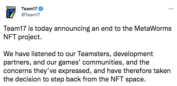 Team 17 might not be the household name that it once was, but for gamers of a certain age, the company is legendary. It developed the iconic Worms series, one of the defining titles of the early console era. Metaworms was supposed to be a generative project based on Worms artwork. Perhaps anticipating a backlash, Team 17 announced that it wouldn’t be energy intensive and that donations would be made to sustainability projects, but this wasn’t enough to stop a barrage of criticism. Some of this even came from other developers who announced that they wouldn’t work with Team 17 again if they proceeded down this route. As the team endured abuse across multiple networks, there was also speculation that Team 17 employees hadn’t been notified of - and weren’t on board with - the NFT plan. In total, the Metaworms projected managed to survive a day before being axed.