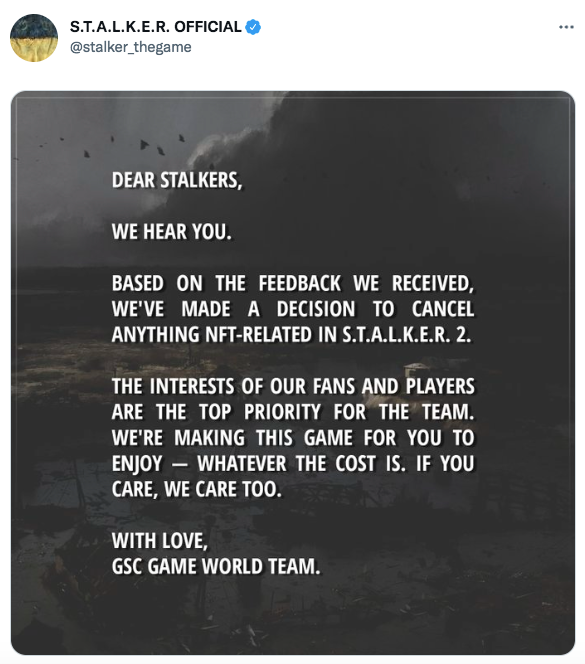 The S.T.A.L.K.E.R series is a popular survival horror game on Windows and Xbox. It utilises the powerful Unreal Engine and is set to be one of the biggest releases of 2022. Developers GSC Game World announced a raft of NFT functionality including the chance to become a “meta human.” Players would have bid for an NFT at auction with the winner being scanned into the game as an NPC. A huge and vocal backlash followed on social media. At first, GSC tried to explain the decision (raising several valid points about smaller developers needing to raise cash to create) and asked fans to understand, even if they didn’t agree. The fans did neither. The tweet was quickly deleted and replaced with one announcing that NFTs would not be included in the game. Quite the turnaround, and one that only took 24 hours.