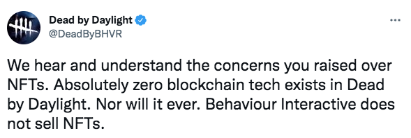 Behaviour Interactive is the developer behind Dead by Daylight, a wildly popular online multiplayer survival horror game. Survivors battle a killer trying to impale them on hooks and sacrifice them to a higher power named The Entity. The developer collaborated with Boss Protocol to release 10,000 Pinhead NFTs. Confusion quickly took hold as it was initially presumed that the NFTs would give players exclusive in-game content, which Behaviour Interactive denied. Reaction to the news was overwhelmingly negative and one Twitter user even demanded a refund on the latest DLC because they didn’t know it would be used to fund NFTs. In response, Behaviour Interactive issued the following confusing apology: