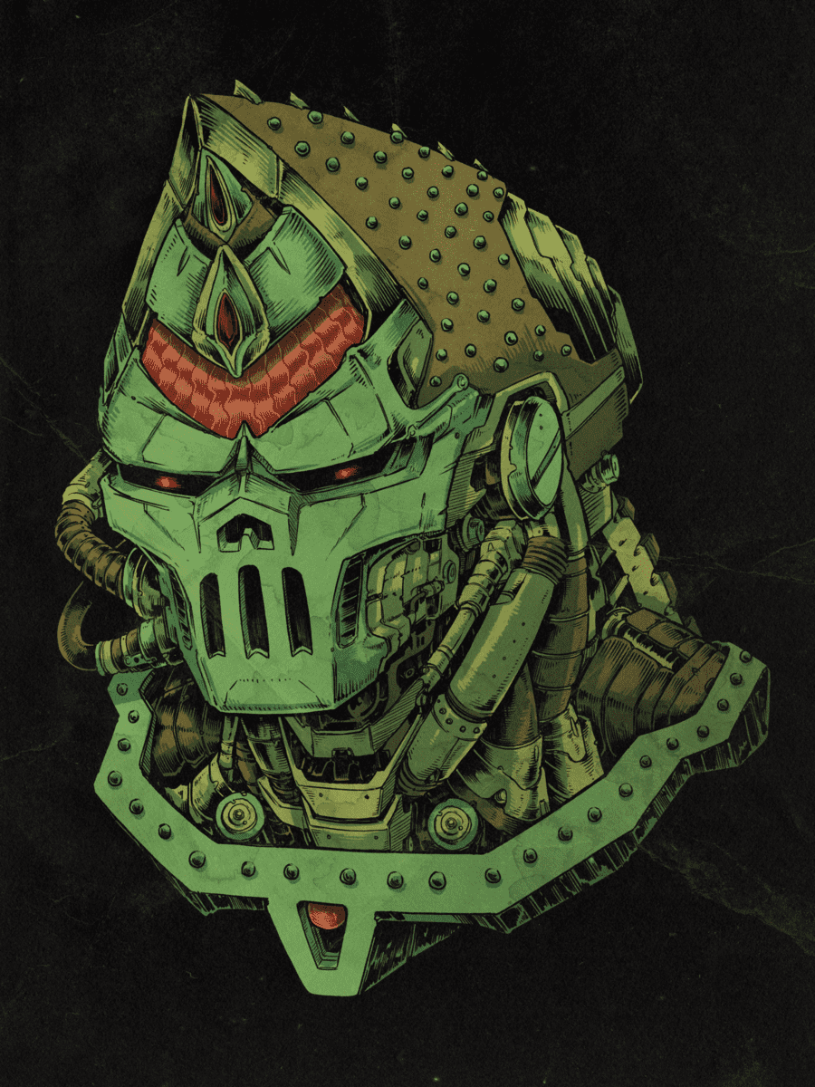For Cyberdoom Funeral Mask, Killer Napkins wanted to create a death mask that combined with his love of sci-fi vibes. He is fascinated with some of the ornamental ancient Egyptian funeral masks and wanted to imagine an alternate universe where a futuristic community might use a mask like this in their rituals.