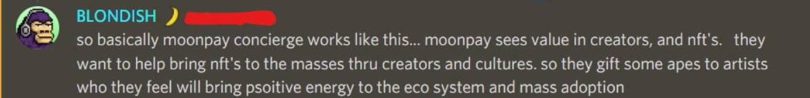 DJ and producer Blondish is another celebrity that acquired NFTs through MoonPay. A screenshot taken by Cobie shows that Blondish has backed up the theory by writing, "So basically MoonPay concierge works like this: MoonPay sees value in creators, and NFT's. They want to help bring NFT's to the masses thru creators and cultures, so they gift some apes to artists who they feel will bring positive energy to the ecosystem and mass adoption."