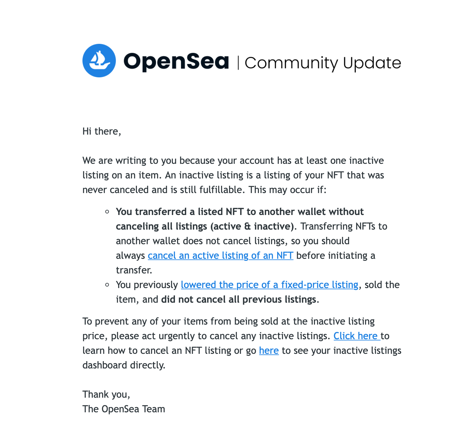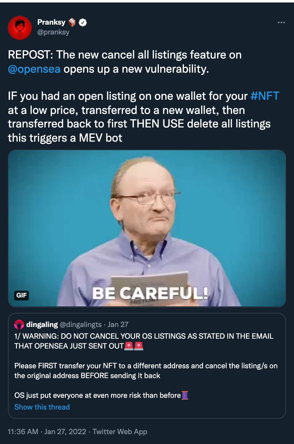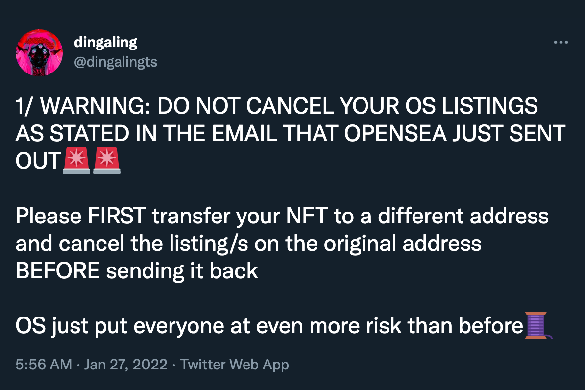 The problem with the OpenSea email is that it leaves users vulnerable to the same exploit that it was trying to prevent. A person who cancels an old listing alerts exploiters that an NFT is being canceled, allowing them to front-run the cancellation and buy at a low price. This is why Twitter user Dingaling says the best way to ensure that the exploit can't happen is by transferring the NFT to another wallet, canceling the old listing, and transferring the NFT to the original wallet. Transferring the NFT to another wallet ensures that the NFT is not bought, exploiter.Â