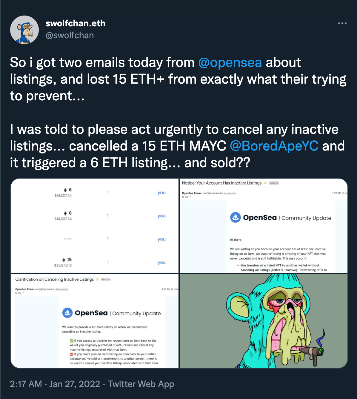 But this email was seen as another major fail as it led to more NFT's being sold at old listings. This was the exact case for Swolfchan; he canceled an old listing of 15 ETH for his Mutant Ape just like the email told him to do. But this cancellation resulted in an exploiter buying the Mutant Ape for an even older listing of 6 ETH.Â