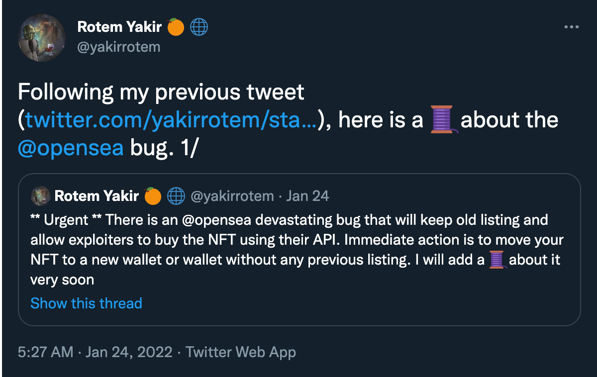 It was not until Monday, January 24, the exploit came back into the spotlight after Bored Ape #9991 was sold for 0.77 ETH. It was then that NFT Twitter users started to explain and warn about the exploit. According to Rotem Yakir, the exploit results from a mismatch between the data in NFT smart contracts and the information presented by OpenSea's UI.Â