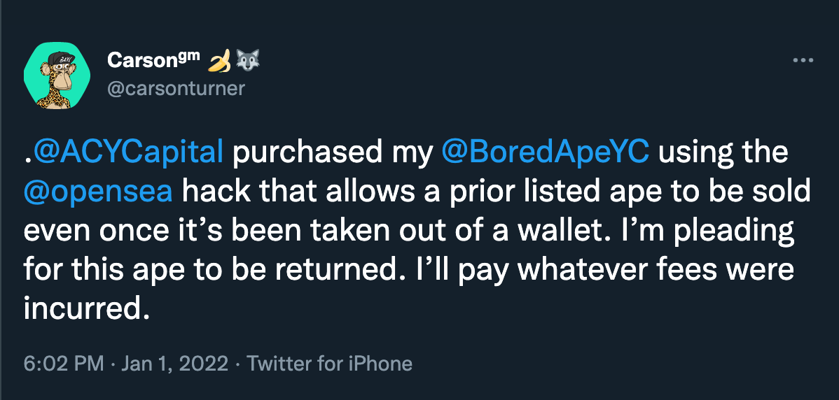 This exploit is not new, as one of the first mentions of this exploit came on January 1, 2021, after Carson Turner noticed that his Bored Ape #2643 was sold at a previous listing. It was mostly unknown how sales like these were being made at the time.Â