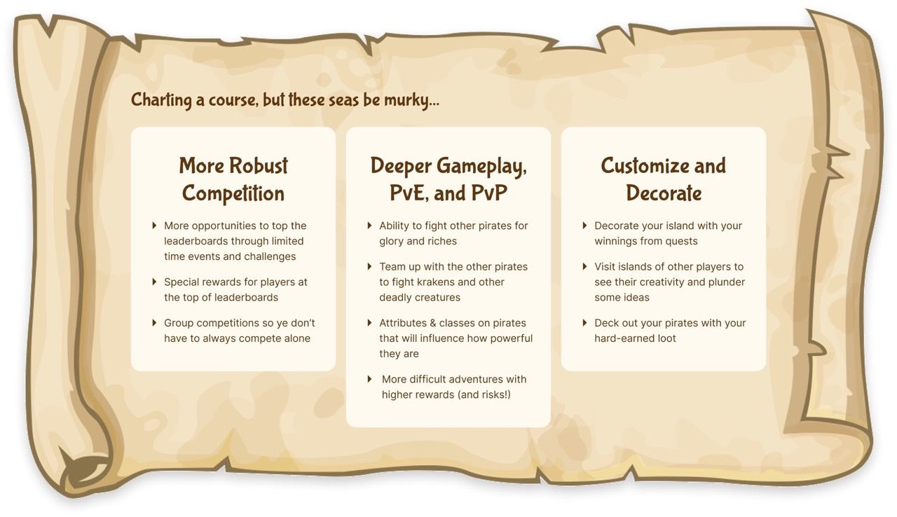 Our in-game assets are dynamic, which means they grow and change as ye explore and improve yer crew. The pirates level-up and gain new abilities as ye complete quests, and that data is stored on-chain and travels with yer pirate forever. pic.twitter.com/jtIZlV2F4V