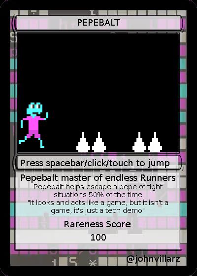 Created by the late John Villarz in 2017, another core contributor to the Rare Pepe community, PEPEBALT is the first video game built into a Rare Pepe card. Holders can access the micro-game by clicking on Bonus Content inside the Rare Pepe Wallet. The gameplay is simple: tap the spacebar to jump over spikes. Only 600 NFTs were ever issued.