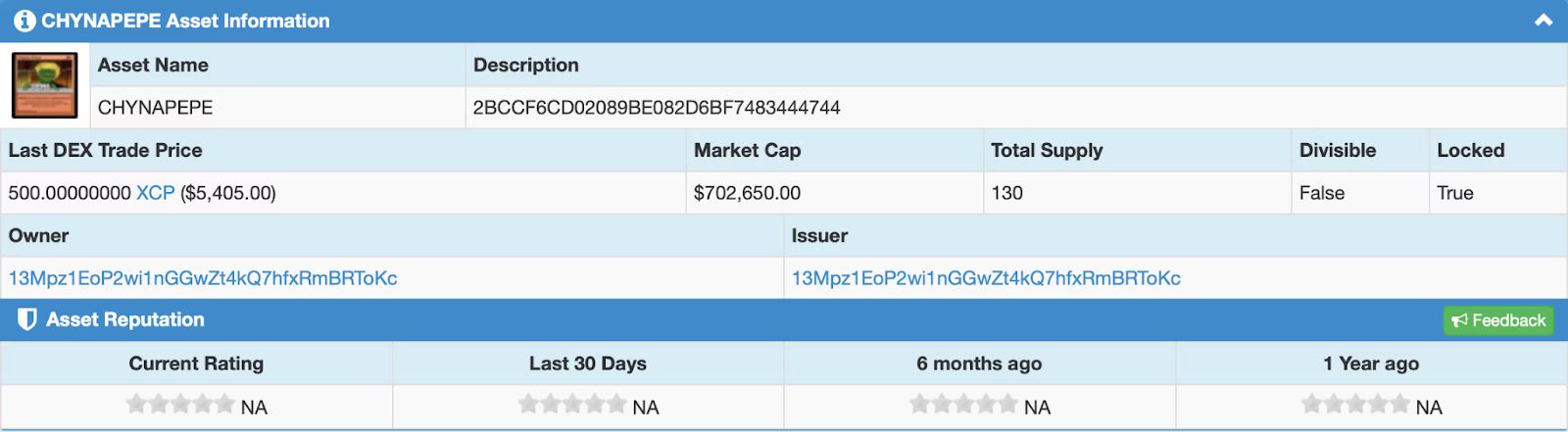 Creators Goat and Bench solved the problem of NFT mutability by embedding the MD5 hash of the original Chyna Pepe image directly into the token’s description field. You can view it here: https://xchain.io/asset/CHYNAPEPE