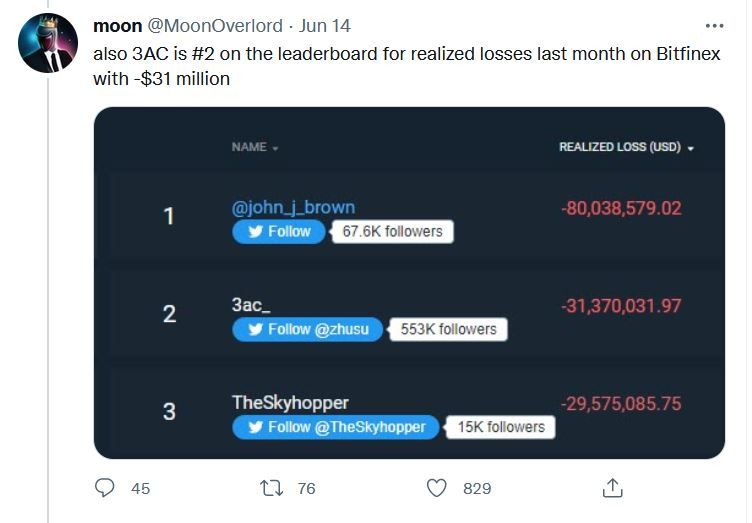 What’s more, 3AC suffered catastrophic losses in the past month. 3AC got rekt hard after the Terra Luna crash, with over $559.6 million locked up in the currency that is now worth only around $640.75. 3AC also wound up at number two on the leaderboard of total realized losses, counting upwards of $31 million.