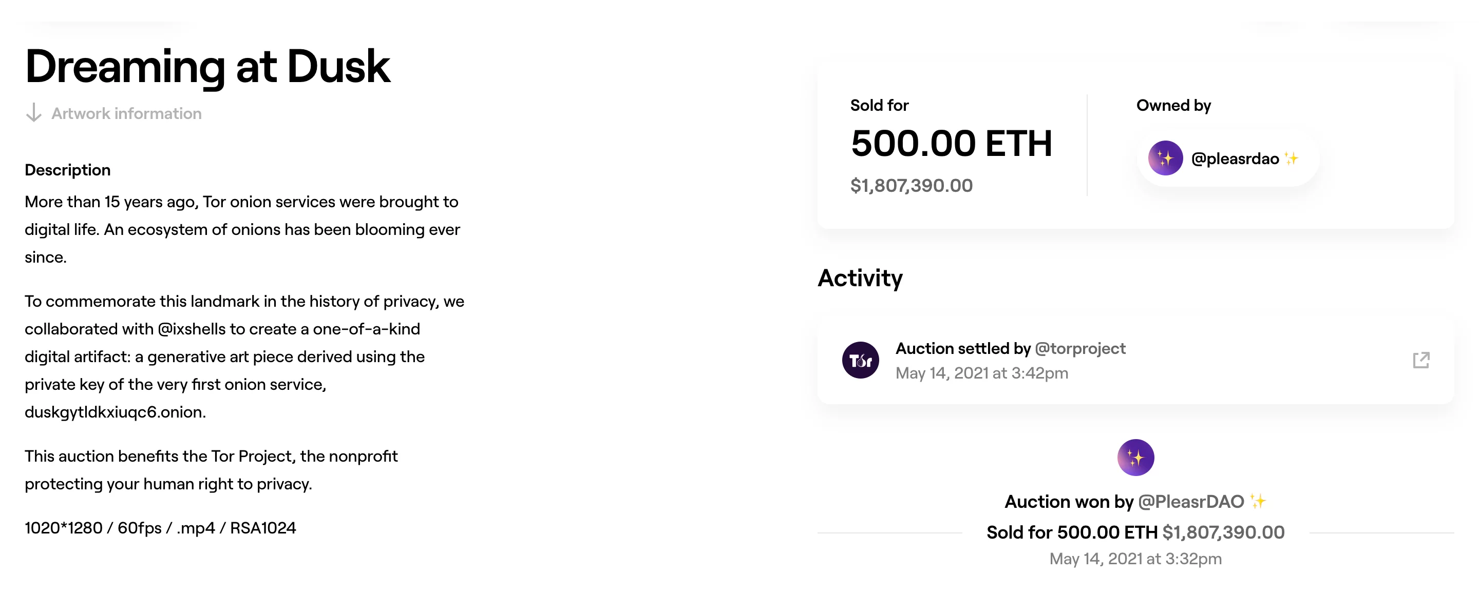 The piece was a collaboration between the TOR Project and ixshells to mark the 15th anniversary of Tor onion services. The NFT was a generative art piece based on Tor’s first .onion site, duskgytldkxiuqc6.onion. The NFT also transfers the private key of the site to PleasrDOA.