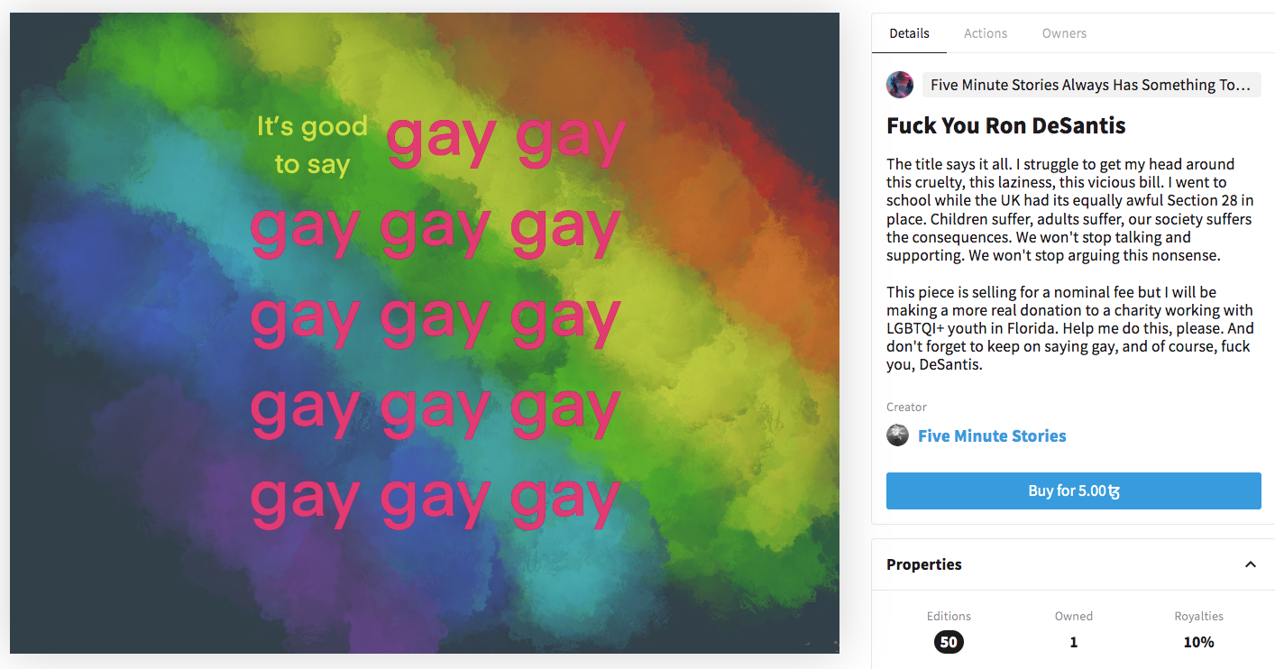 A writer and poet, FiveMinuteStories has carved out a space for NFT poetry and literature on Tezos, encouraging countless other writers in their wake. Their work tackles heteronormative expectations through short poems and outright protest pieces. A 50 edition piece simply entitled “Fuck You Ron DeSantis” raised money for LGBTQ+ youth charities in Florida. The short and witty nature of 5MS's writing is attention-grabbing and always raises a smile. This playful style helps them to tackle serious issues in a down to earth manner. FiveMinuteStories is also a founding member of the Tezos Collectors Crew, helping to support upcoming artists in the space.