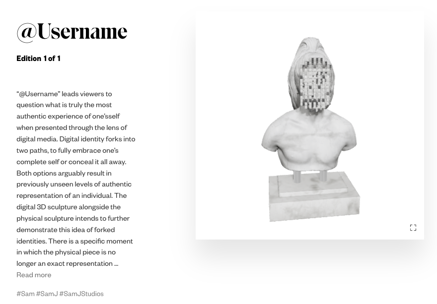 SamJ is a SuperRare artist whose experimental work sells for tens of thousands of dollars. Their last piece @Username was bought for an impressive 25 ETH. In their own words, SamJ’s practice is heavily influenced by their “queer identity.” Their work pushes boundaries both artistic and social, challenging preconceptions of art and self. They’ve been widely showcased too, including at Art Basel Miami and the LA Art Show earlier this year.