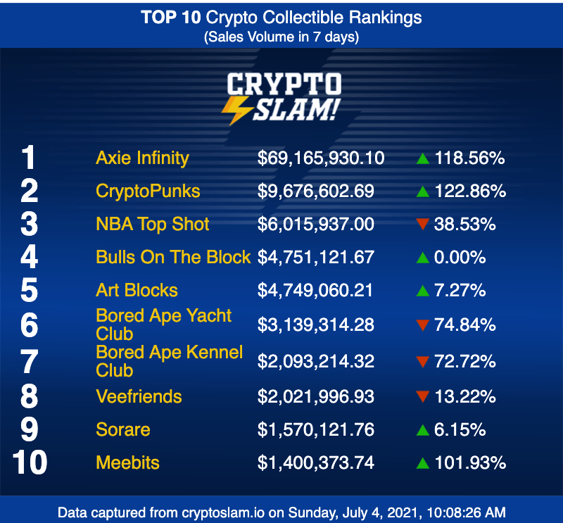 In other NFT news, Axie Infinity has exploded in sales volume and has overtaken NBA Top Shot as the most traded NFT item in the market. According to Crypto Slam, Axie Infinity is up more than 335% in sales volume over the past 30.