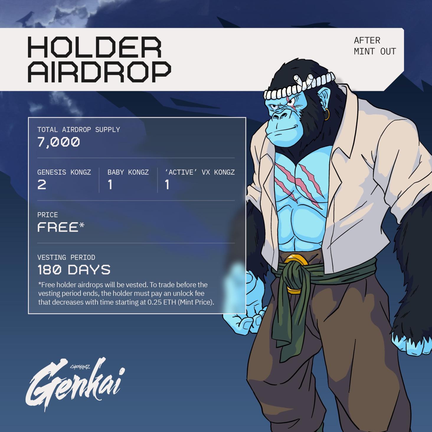 In a show of appreciation to their existing community, CyberKongz will be airdropping 7,000 Genkai NFTs to current CyberKongz holders. These airdropped Genkai NFTs will come with a vesting period of 180 days. During this period, holders wishing to trade their Genkai NFTs will be required to pay an unlock fee that starts at 0.25 ETH, the original minting price, and decreases over time.