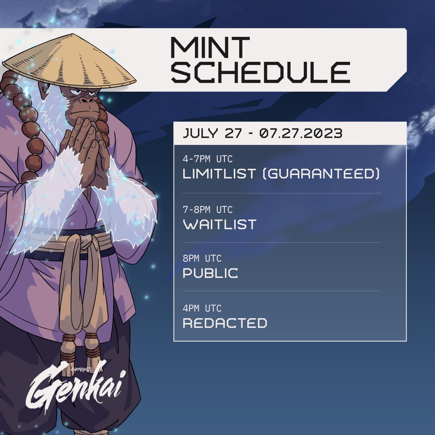 The minting process kicks off with the Limitlist Sale, taking place between 4 PM and 7 PM UTC. This initial phase is exclusively for individuals who have been placed on the Limitlist, who are guaranteed the option to mint two Genkai NFTs each.