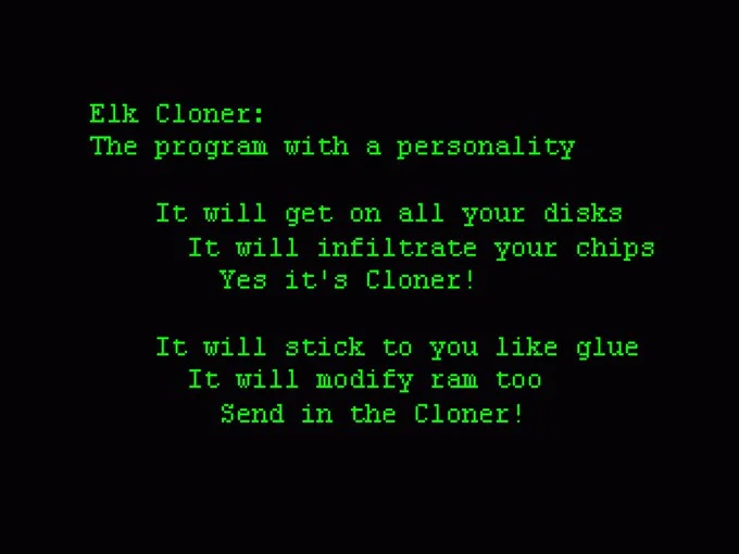 Elk Cloner is one of the first known microcomputer Viruses that spread "in the wild", i.e., outside the computer system or laboratory in which it was written. It attached itself to the Apple II operating system and spread by floppy disk. It was written around 1982 by programmer and entrepreneur Rich Skrenta as a 15-year-old high school student, originally as a joke, and put onto a game disk. Elk Cloner targeted Apple II machines, causing them to display the following poem.