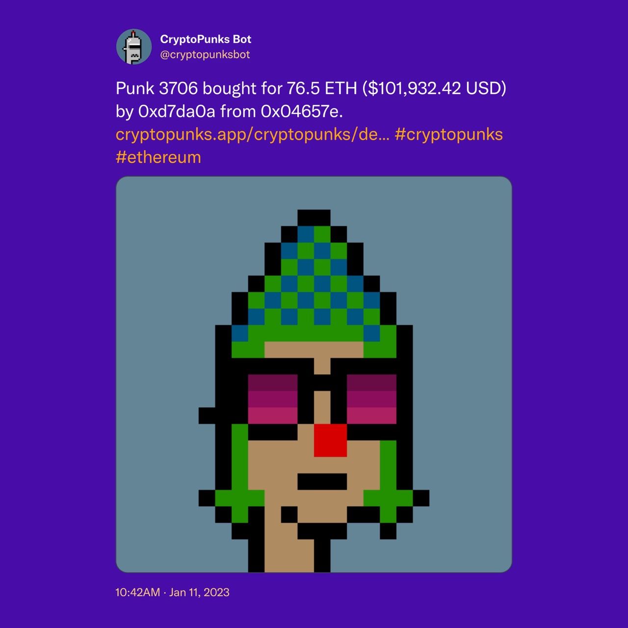 After eight days, the hacker parted with Punk #3706 for 76.5Eth, or $101,932.42. Investigations are ongoing. Perhaps some or all of that Eth, plus other funds and NFTs stolen from Novo, will get returned. In the meantime, as Dario De Siena wrote on the GoFundNovo page, “So many projects are seen as financial investments, this will be an investment in to the Web3 culture.”