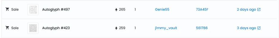 Another amazing week for Autoglyphs, there were 2 sales each over 250 ETH. #423 bought for 259 ETH and #497 was bought for 259 ETH. The floor currently sits at 290 ETH with one Autoglyph left before breaking 350 ETH.