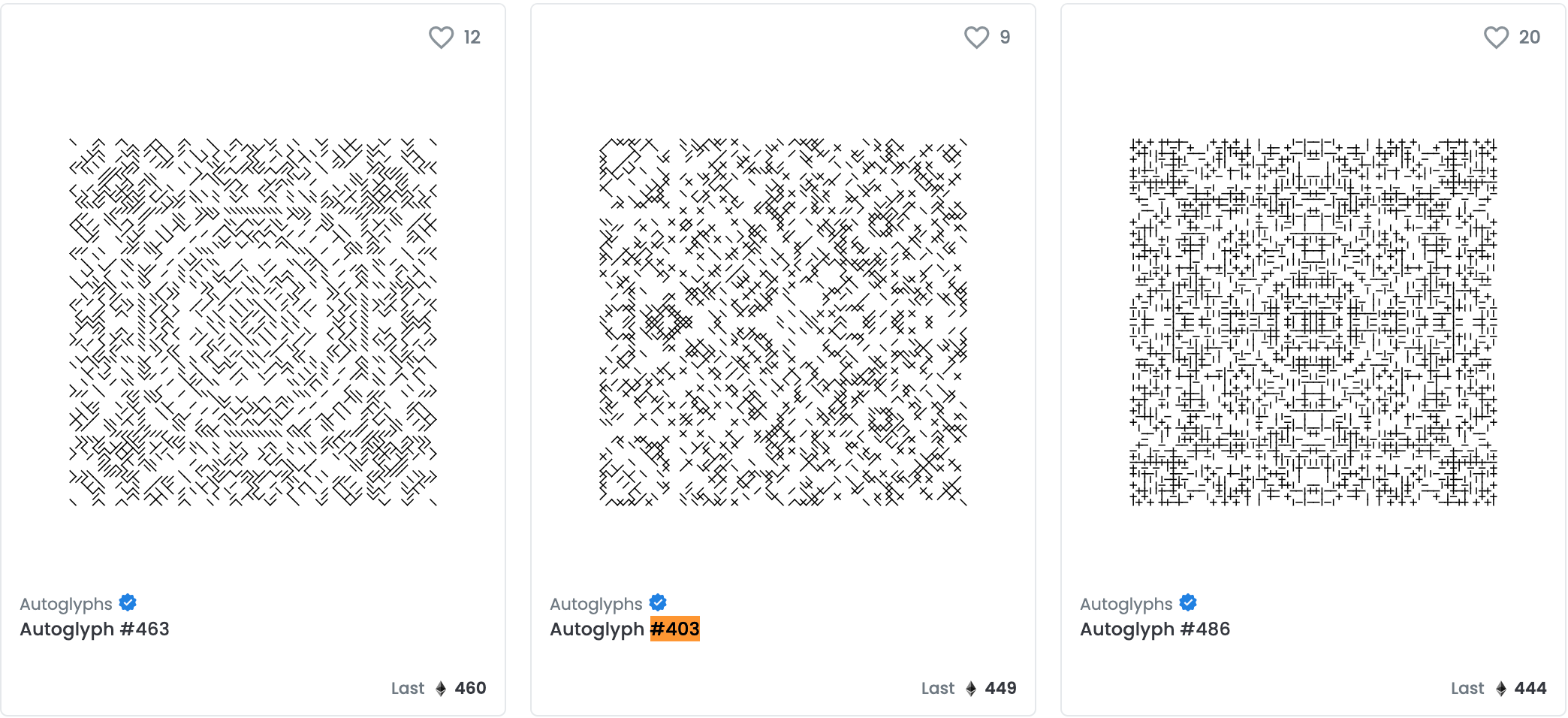 Larva Lab’s Autoglyph project is still come up with Autoglyph #463, setting an all-time high sale when it sold for 460 ETH. Autograph #403 and Autoglyph #486 took the number two and three spots for the highest sale for Autoglyph when they sold for 449 ETH and 444 ETH.