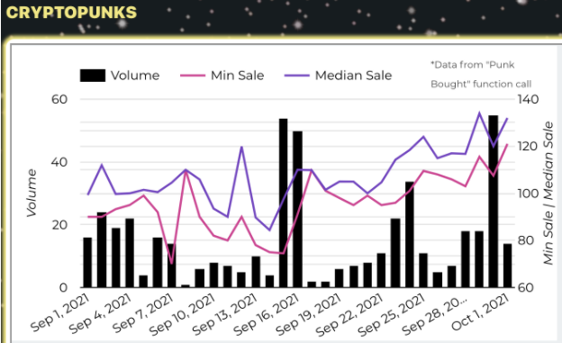The CryptoPunk market has begun to pick up again as well. In Mid September we saw the minimum sale range between 70 - 80 ETH. Since September 15th and 16th volume, floor and median price has been continually rising. There have been 3 large volume days with over 50 CryptoPunks sales this month.
