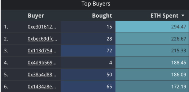 We are seeing some wallets making some big bets on Cryptoadz as well. When looking at the top buyers since the project launch we can see the 0xe301613 spending ~295 ETH on 15 Cryptoadz.