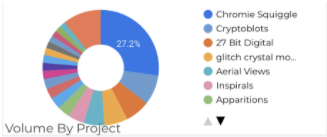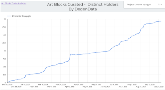 This month Chromie Squiggles have dominated all Art Blocks Curated volume with 27% of all trade volume (by transactions count).