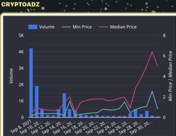 In a period of 4 days between September 20th - 24th, the median price of a Cryptoad rose from .9 ETH to above 6 ETH. At the time of writing, the floor is currently at 5 ETH.
