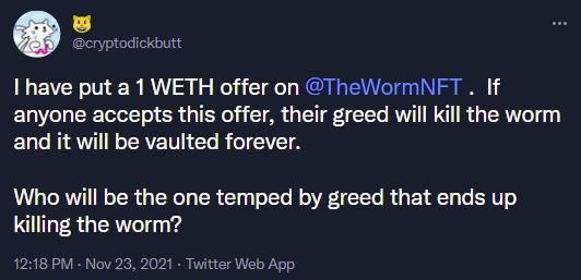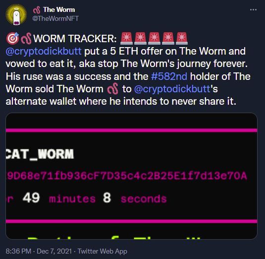 @Redlioneye offered the premium of 5 ETH to rebuy the Worm in order to let it continue its journey, but was rebuffed. Our Subscribers even supported the cause by rallying to contribute funds to be used to repurchase the Worm to get it moving again (thank you, Subs❤️). Here’s the hoping that this is nothing but a temporary hurdle in the Worm’s journey and it can crawl out sooner rather than later.