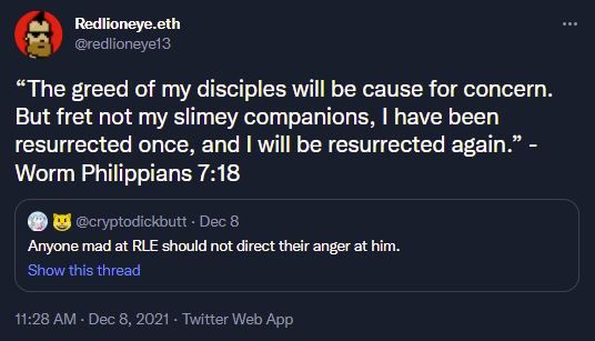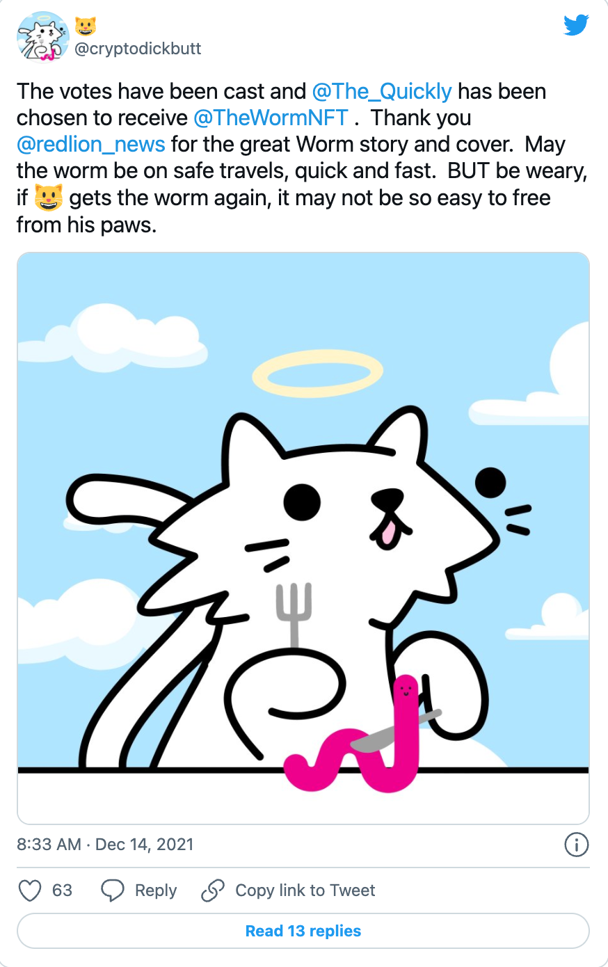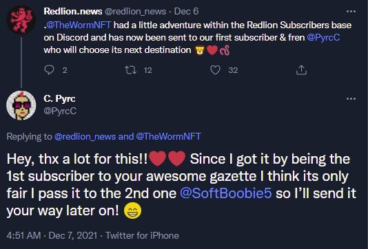 The Redlion Discord recently had fun passing the Worm around its subscribers. @Redlioneye received the Worm and we thought it would be fun to give the Worm a run among our subscribers. We proposed the idea on our Discord and got a great response. We put together a sequence of subscribers who would receive the Worm then started our speed run. It was a fun moment for our channel, which could have been cut short if any recipient had taken advantage of the active offer of 5 ETH on OpenSea at the time. Hats off to our amazing subscribers. Following the successful run, we decided to transfer the Worm to our first ever Redlion subscriber, @C. Pyrc.