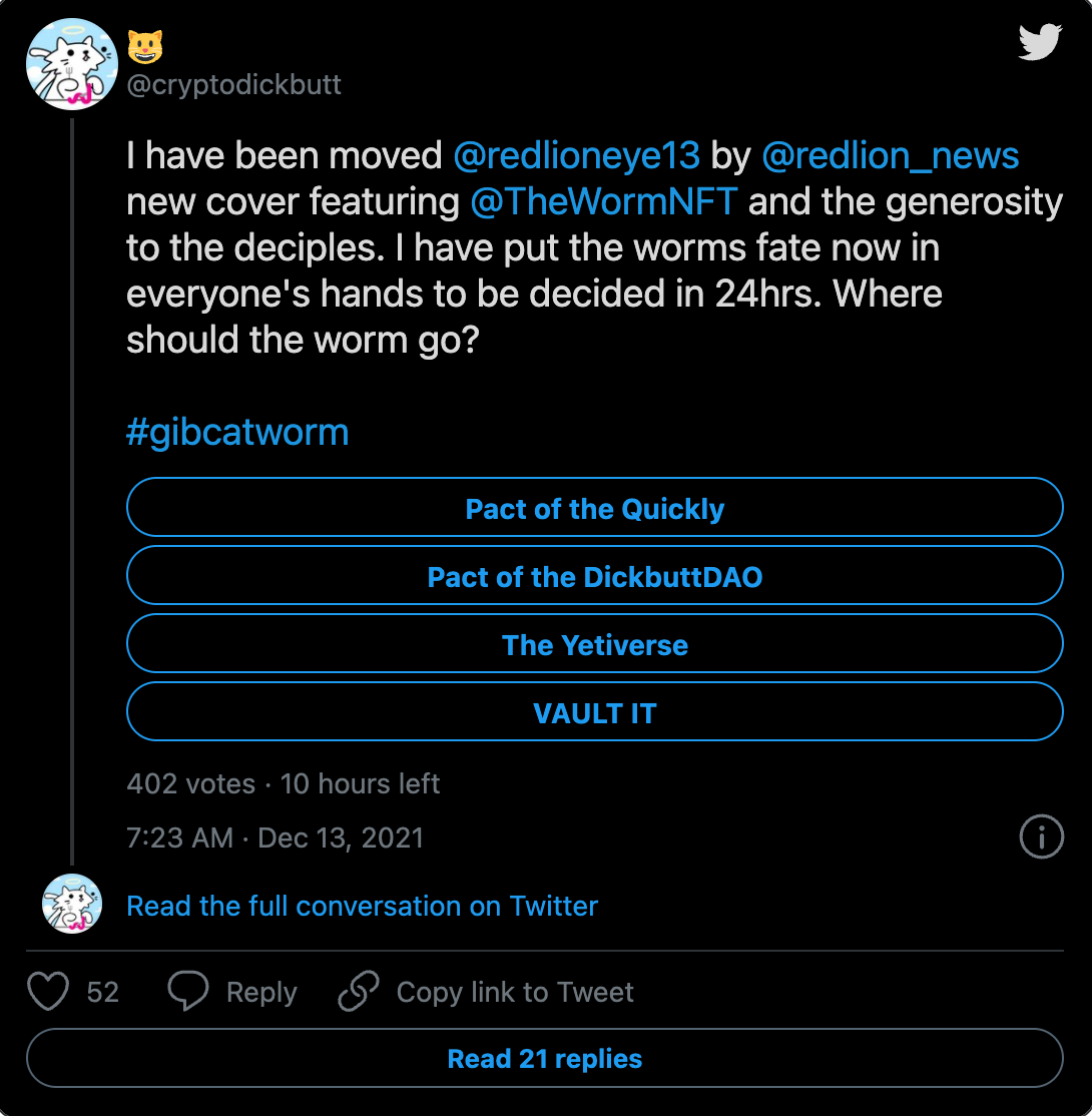 After our gift to the church of worm, Cat was moved and he changed his mind. The Cat opted to put up a public vote where the worm would go next. It was a two way battle among Dickbutts vs The pact of wormly. Yetiverse (for the lols), VAULT IT being other options. The Dickbutts DAO was winning and then someone from the pact bought votes, triggering Dickbutts follow suit, but in the end the pact won! which is amazing because they really wanted it and they plan to speed run it. Being an underdog, and their sheer will to get the worm. They eventually got it. We loved the dirty play and the story had an amazing to the chapter. We are thrilled to be a major part of it and we are sure worm has a long way to go, bless thousands of wallets and be the the focal point of many exciting chapters to unfold.