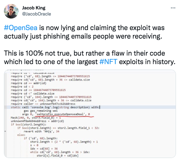 Although the attack has now been confirmed as phishing, there was initially some confusion. Conflicting and unverified reports in the early hours of Sunday spread panic across Twitter as users suggested that there might be vulnerabilities in the new contract. Some even claimed to have lost their NFTs without opening their emails or clicking any dubious links. Heaping further fuel on the fire, @JacobOracle uploaded a screenshot showing how flaws in the new contract could supposedly give hackers access to wallets. Unverified talk of an exploit in the X2Y2 contract had been buzzing around Discord, too. Now discredited, these claims made users incredibly anxious and contributed to the profound sense of confusion and unease across the community.