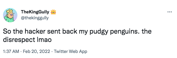 Adding even more drama to the story is the brazen behaviour of the hacker. They’ve so far returned some NFTs and even sent compromised users ETH. One Twitter user reports having their Pudgey Penguins NFT returned while others talk about receiving random amounts of currency. Although it’s impossible to guess the motivations behind this kind of behaviour, the hacker certainly seems to be mocking OpenSea. As upsetting as it is for the owners, the theft of just 32 NFTs is further proof that this was pure phishing. Any flaws in the contract would (presumably) have led to a much larger attack.