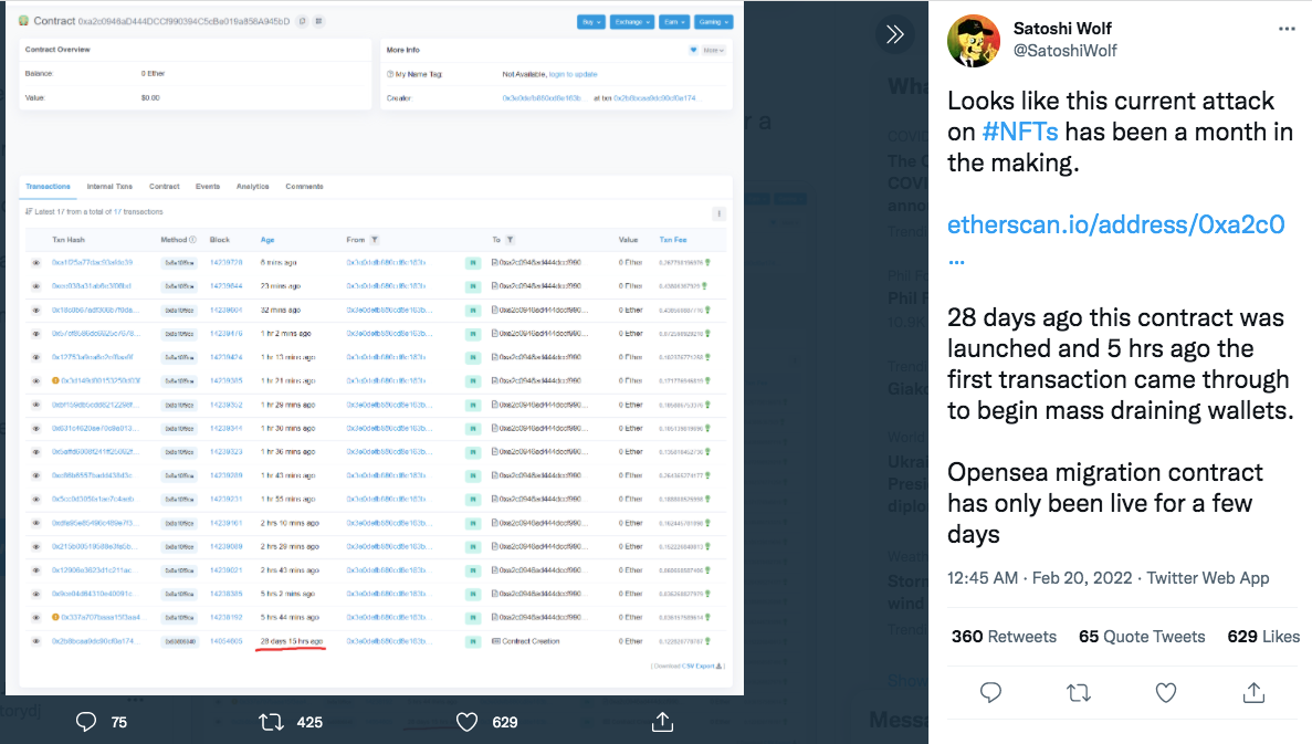 This has been a long time in the making. Transactions on Etherscan show that the fraudulent contract was uploaded 28 days ago. In the email phishing scenario, the hacker then sent fake emails and watched as signatures built up. When enough people had signed, they simply pulled the trigger and executed the theft. There’s an element of time pressure (the attack needed to be triggered before older listings expired) but the hacker was otherwise able to sit back as the fraudulent contracts were signed.