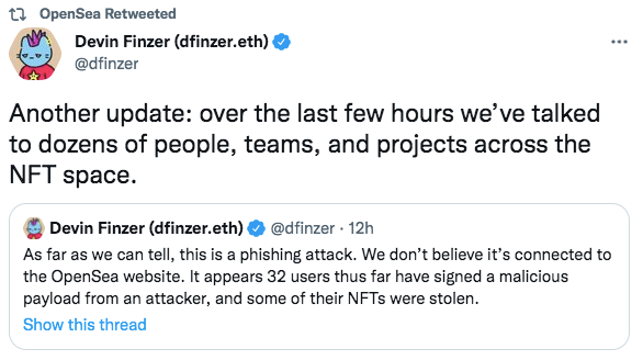 Since OpenSea imposed such a strict deadline on the migration, users were necessarily forced to act fast, making them more vulnerable. The urgency of the migration probably played a part, with people in a hurry to get the job done. In response to the news, OpenSea tweeted a warning advising users not to click on any external links.