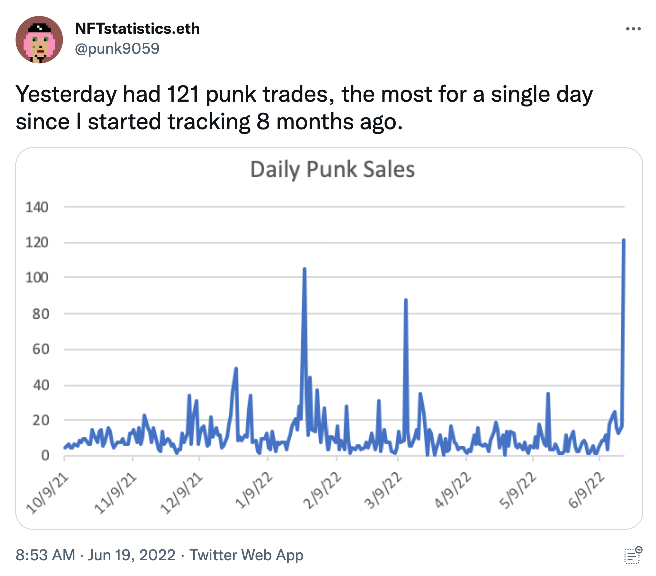 According to on-chain data analysis, as of June 19th at 2PM, 175 Punks had been traded in the last 48 hours, amounting to over $14 million at the time of writing. Transaction volume increased from Ξ200 to Ξ4,000 in just a few hours – making June 18th the highest volume trading day of the entire year for the CryptoPunks collection. These numbers stand out starkly, especially considering the severe bear market conditions.