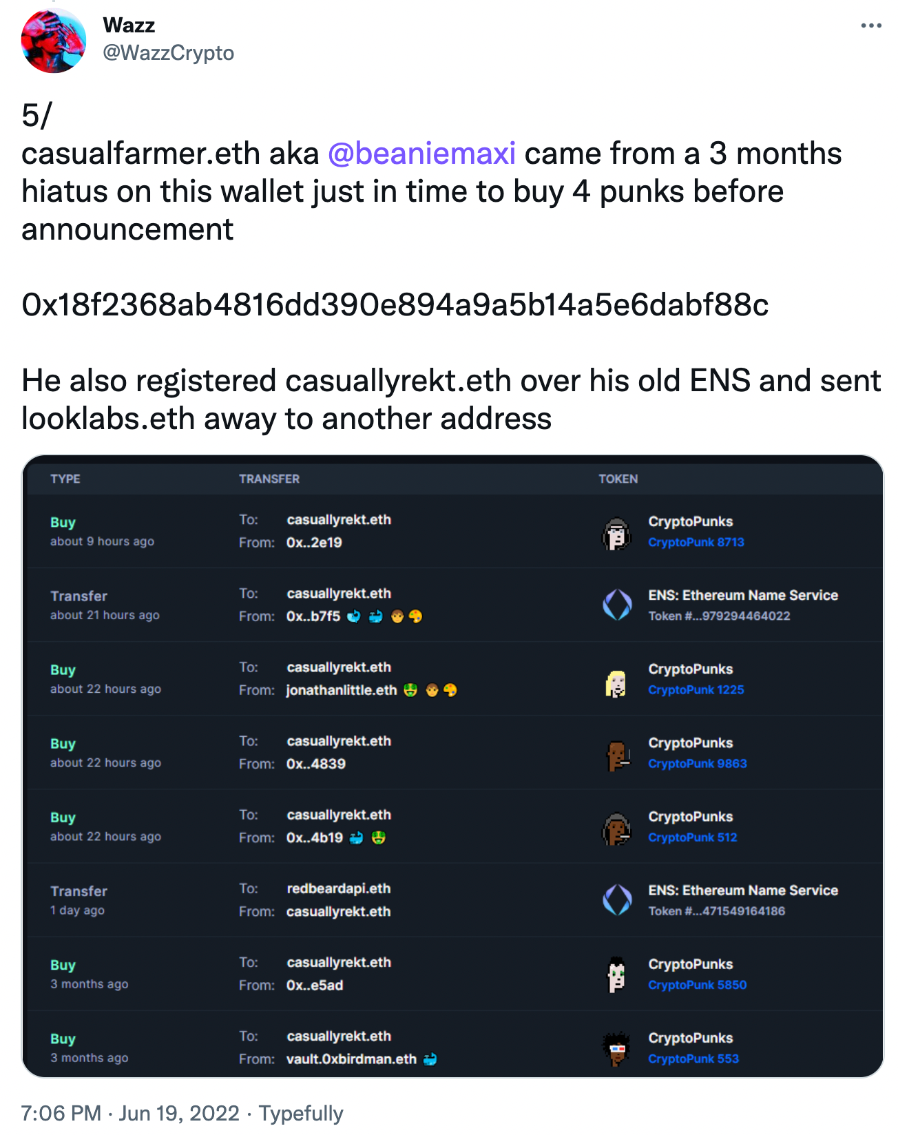 Regarding most recent events, Wazz made a comprehensive thread analysing the on-chain activities of the top Punk buyers in the last 48h, some of which are presumed insiders. These include a wallet address which was freshly funded with Ξ700 from Coinbase and bought 8 Punks hours before the announcement, whilst another belonged to Beanie whose wallet hadn’t been active for 3 months prior and who was supposedly on hiatus.