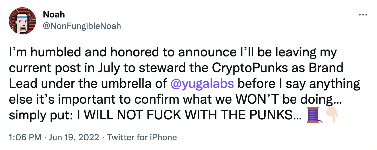 So why the sudden pump? Yesterday, Greg Solano aka Gargamel, co-founder of BAYC, announced Yuga Labs bringing on Noah Davis as Brand Lead for CryptoPunks – a key player on Christie’s NFT team and the brains behind Beeple’s infamous NFT which was sold for $69 million in March 2021, a never-before seen record at the time.