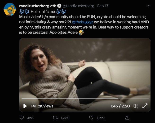 Honestly, I was hoping to end the article here. How much can I really talk about a bad music video? Unfortunately, we’re not just talking about a bad music video. We’re actually talking about two bad music videos. Not even a full two weeks ago, she released a ballad about DeFi to the tune of Hello by Adele, which is foreshadowing that this is going to be her new thing and we should all get used to it. It’s also not her first time doing spoofs. Here’s her pretending to be your mom explaining discord. She even has a whole YouTube channel devoted to pretending to be your mom explaining NFT related terms. So let’s call this what this is. Cheesy at best, queasy at worst. A mid-life crisis, most likely. But a rallying cry for women of web3? Yikes. I hope the women of web3 have a say in that.