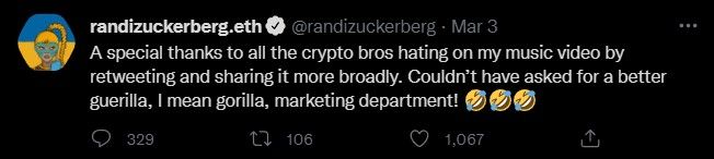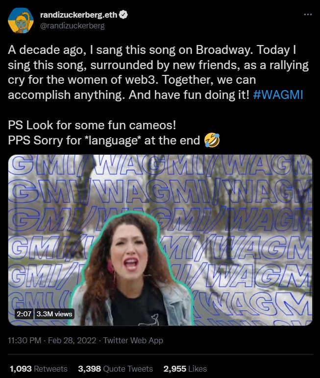 Here’s the thing. Crypto bros suck. They create an unhealthy space that’s not conducive to attracting the rest of the fiat population. Whatever this is, though, is not the antidote. It actually seems more like leaning into the bro-dumb. It’s also eerily reminiscent to when The Bad Crypto Podcast did nearly the same exact thing with the same exact song, two months prior to Mark’s twisted sister’s release. Additionally, there’s something about someone directly related to one of the wealthiest men in the world shouting WAGMI that kind of feels like a bunch of bullshit. Randi Zuckerberg has already made it. She’s more of a WAMI. No amount of shilling, failed past projects, or bad dance moves will convince me otherwise.